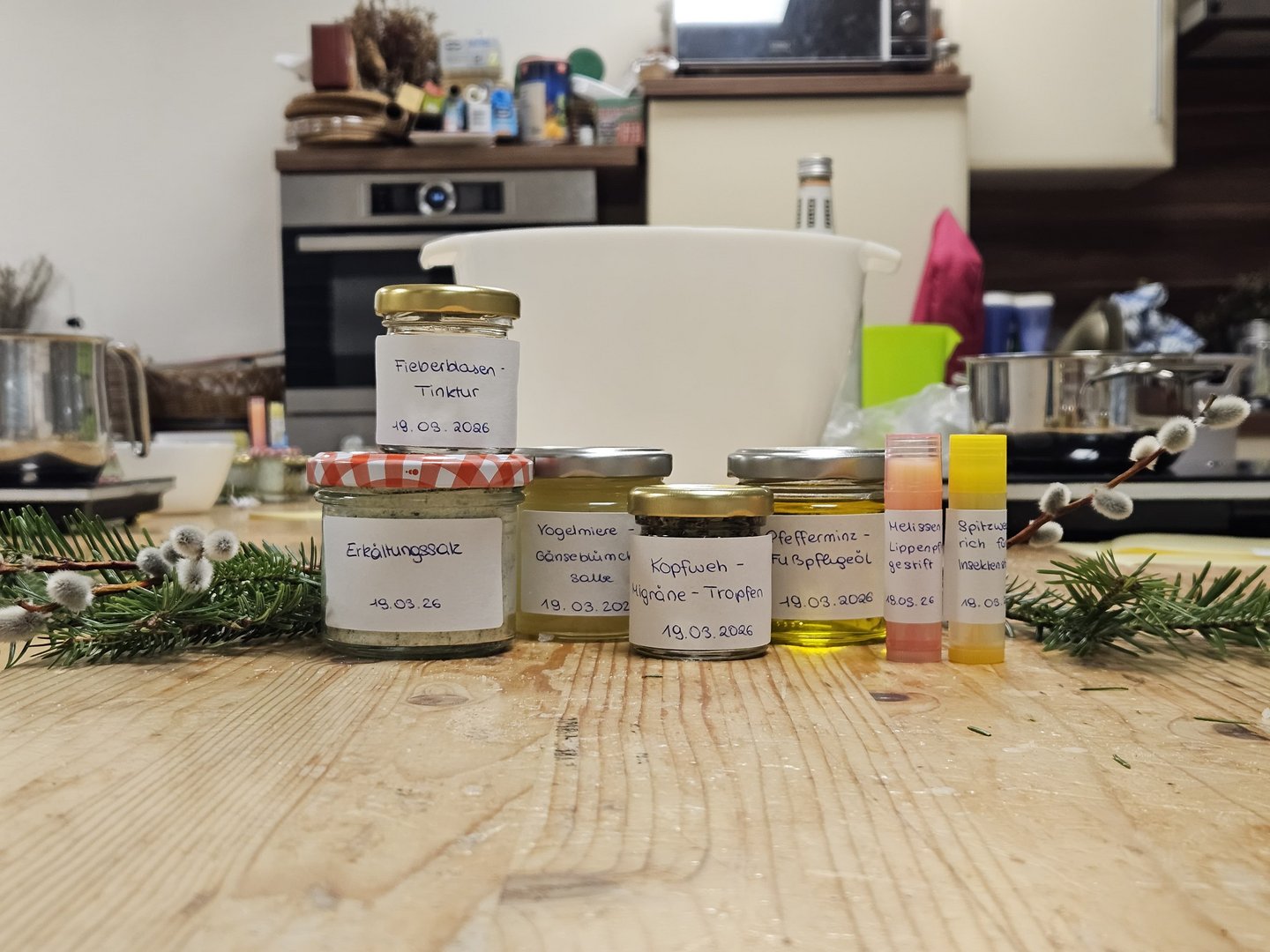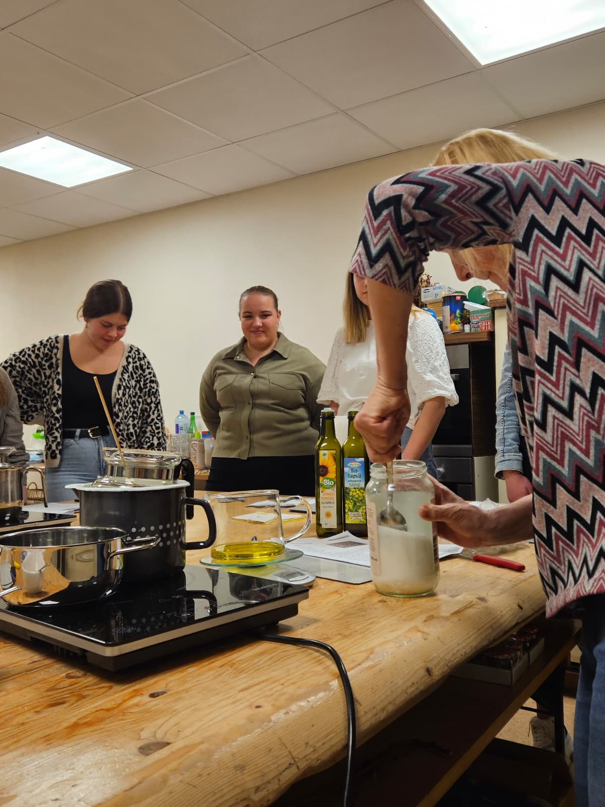 Resy hat den Teilnehmenden gelernt, wie man mit einfachen Hausmitteln, Heilpflanzen und natürlichen Produkten den Alltag unterstützen kann. Von Salben über Öle bis hin zu Tinkturen war alles dabei. Die Teilnehmenden sind nun bestens vorbereitet, ihre eigene Hausapotheke zusammenzustellen!